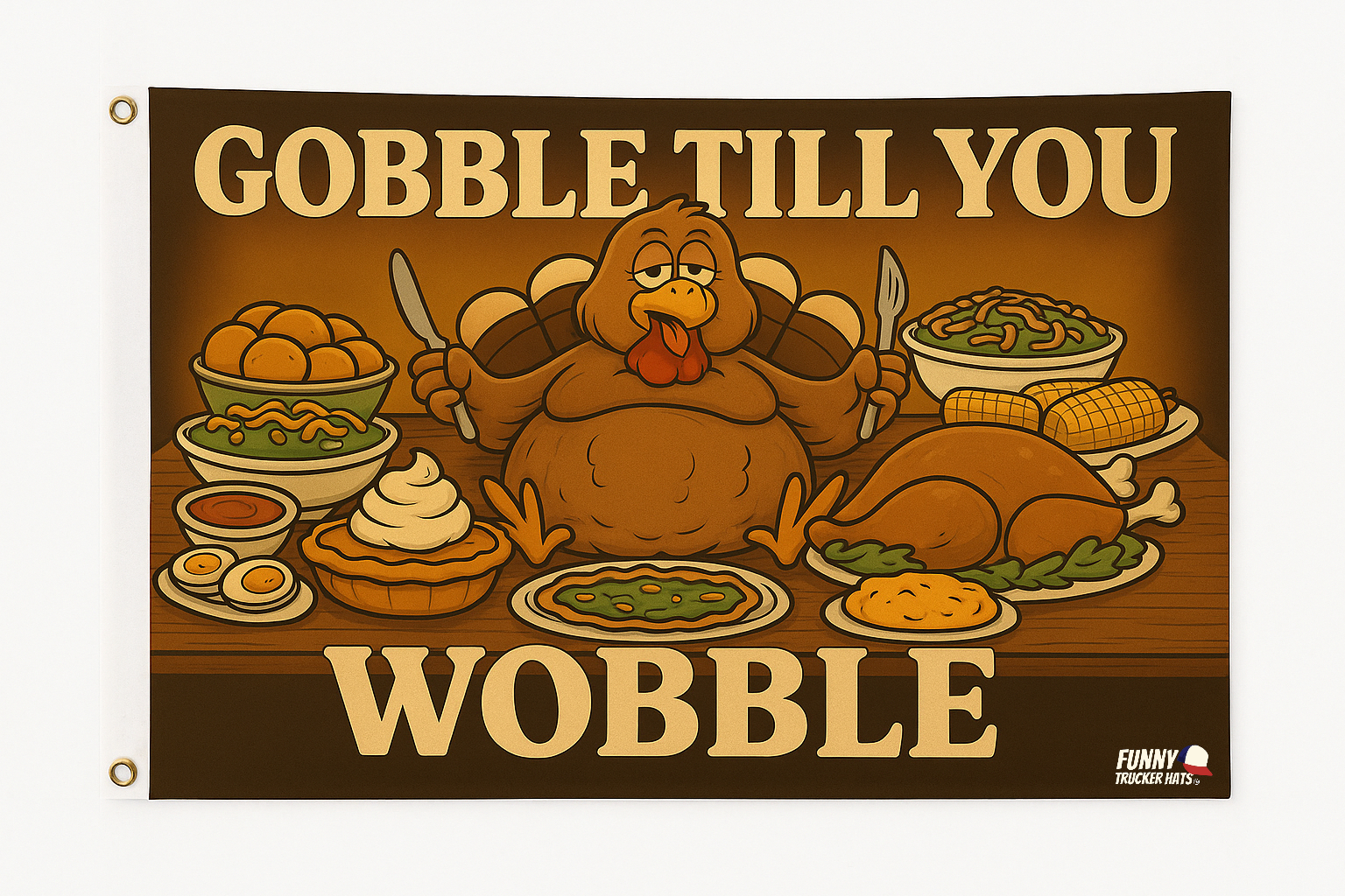 Turn your Thanksgiving or Friendsgiving celebration into a feast of laughs with this hilarious “Gobble Till You Wobble” flag! Featuring a festive turkey and bold fall colors, this 3x5 ft banner brings the perfect mix of humor and holiday cheer to your home, bar, garage, or patio.